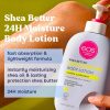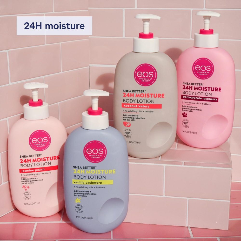 Eos 24H body lotion with instantly moisturizing Shea Oil + lasting protection Shea Butter quickly absorbs for 24-hour hydration. Say hello to… fast-absorption, lightweight, soft skin, and sustainable shea. Say goodbye to… greasiness, heaviness, and sticky residue.