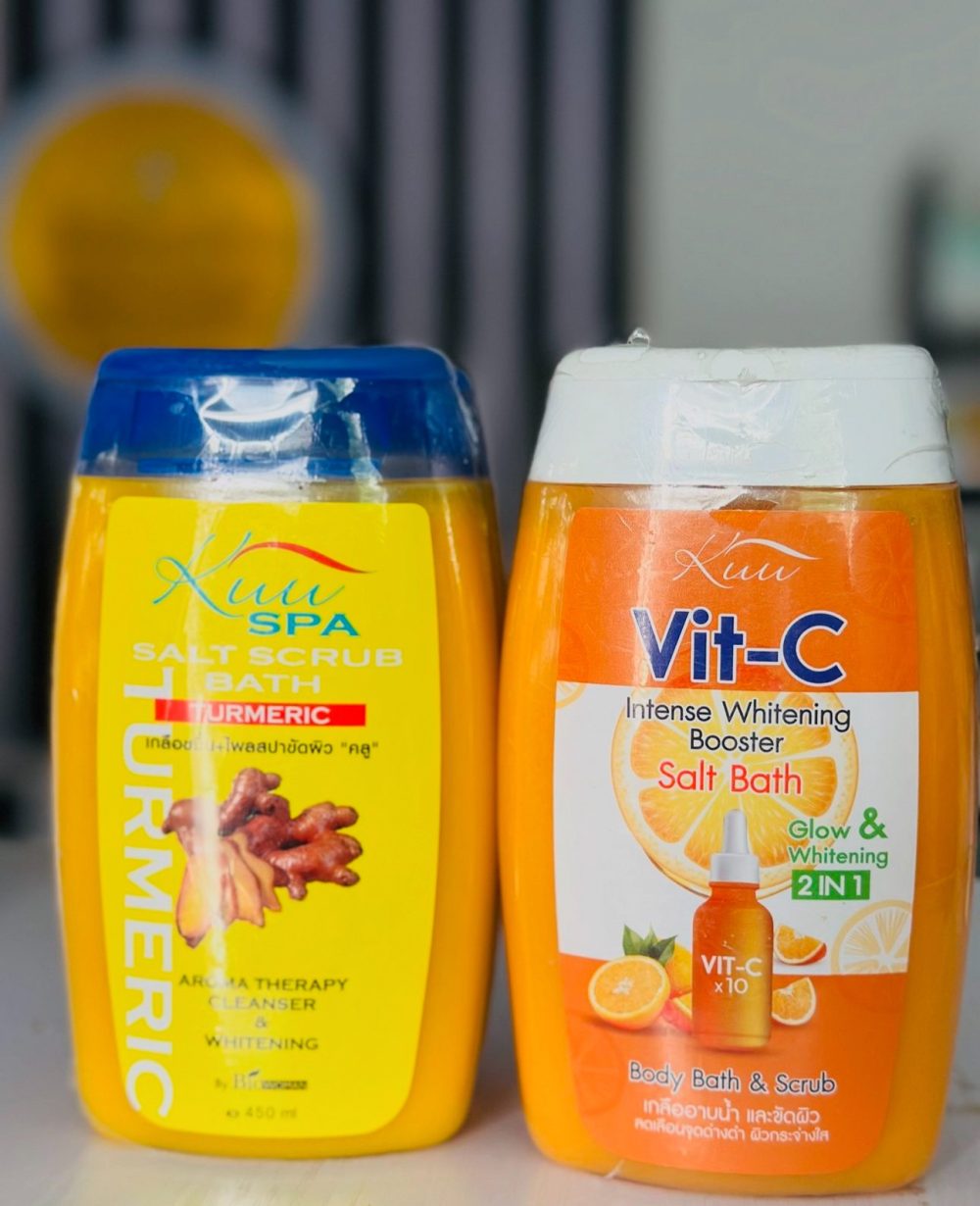 Kuu Spa Tumeric Salt Scrub Bath. Fine-grained Salt and Natural Extracts act as the perfect scrub for your skin with the following Special Abilities